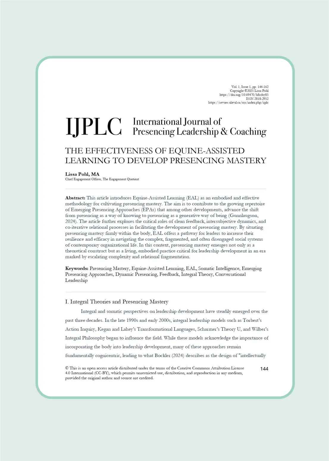 The Effectiveness of Equine-Assisted Learning to Develop Presencing Mastery, realizat de Lissa Pohl și publicat în International Journal of Presencing Leadership & Coaching (Vol. 2, Nr. 1, iunie 2025).