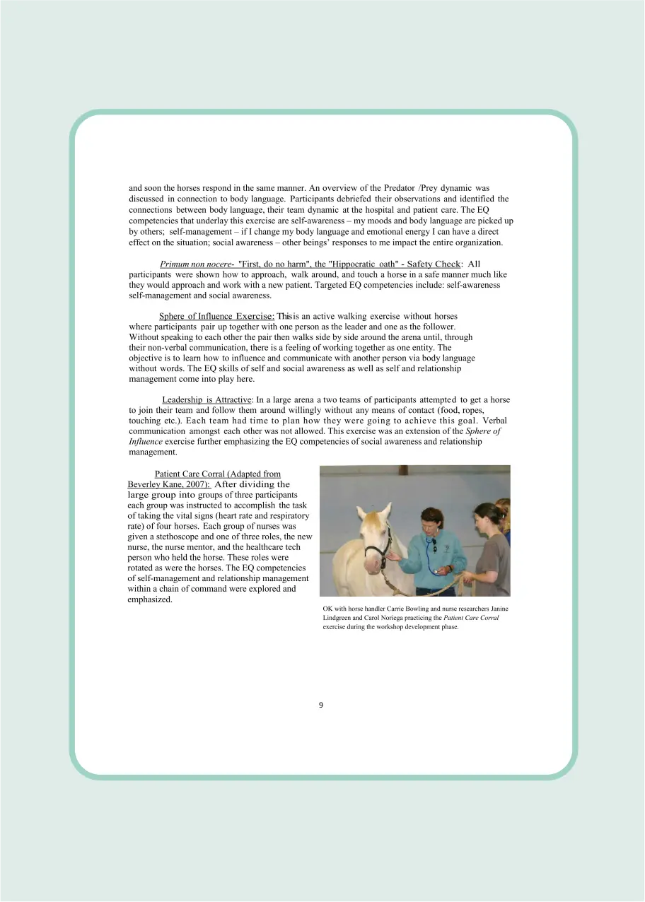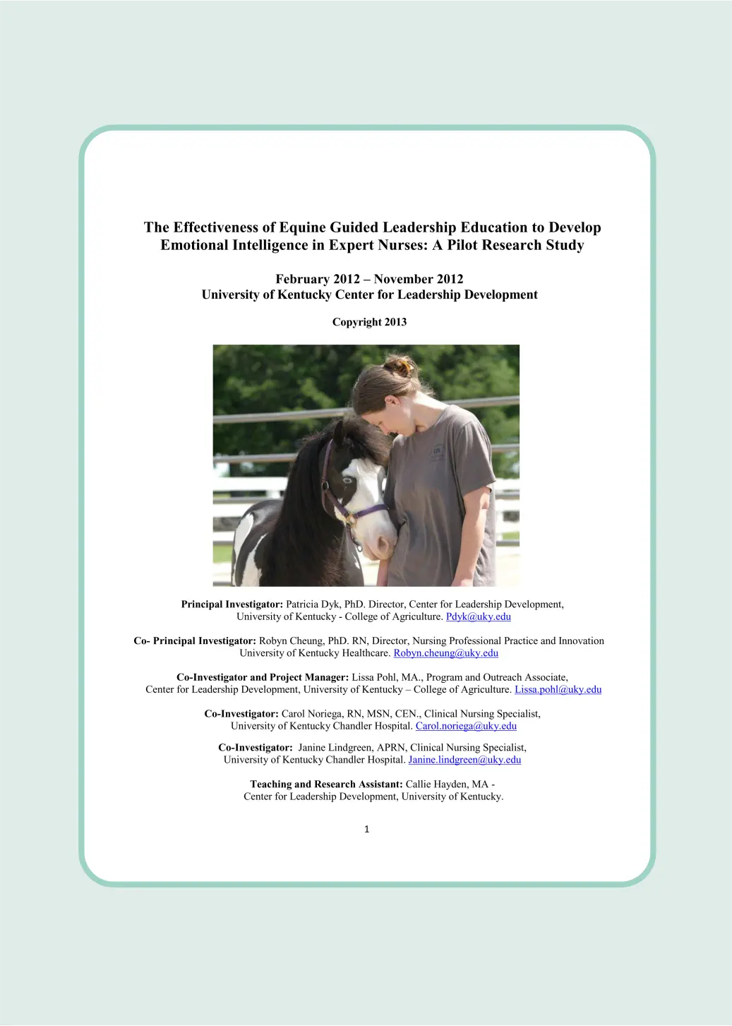 Pentru a verifica această ipoteză, echipa condusă de dr. Patricia Dyk a dezvoltat un program pilot de Equine Guided Leadership Education (EGLE) și a implicat 21 de asistente medicale experimentate din cadrul University of Kentucky Chandler Hospital.