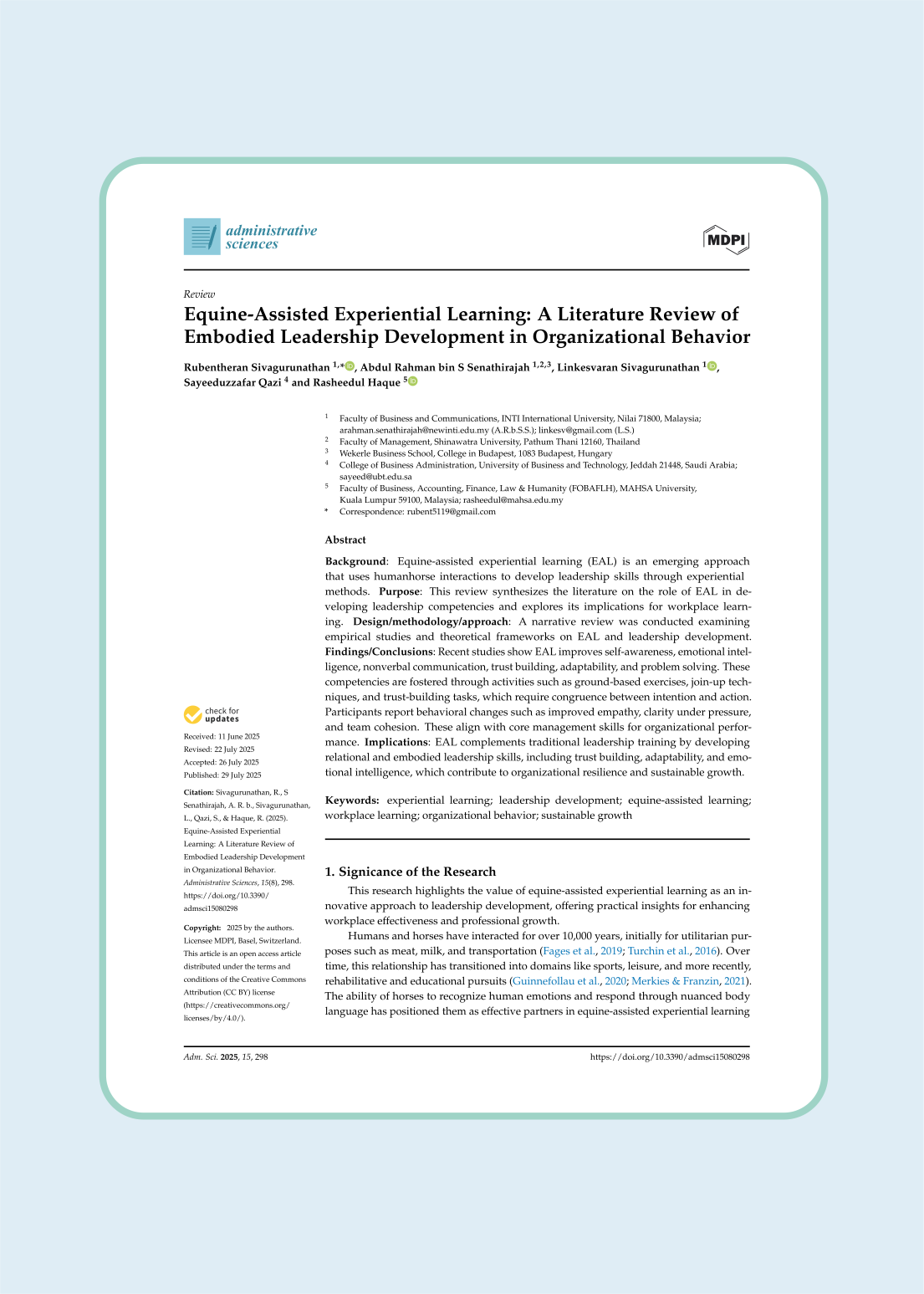 Publicat în revista științifică Administrative Sciences (2025, Vol. 15, nr. 298-321), studiul "Equine-Assisted Experiential Learning: A Literature Review of Embodied Leadership Development in Organizational Behavior" analizează modul în care interacțiunea cu caii în medii naturale - prin metoda Equine-Assisted Learning (EAL) - poate sprijini dezvoltarea abilităților de leadership.